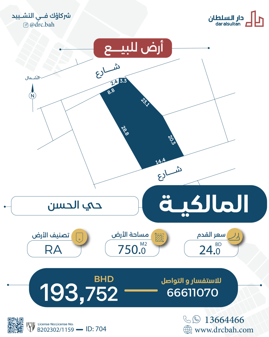 Residential Land for Sale in Malkiya with a classification of RA (Private Residential Area - A). The Land size is 750 SQM, priced at 24.00BHD per SQFT , with a total price of 193,752.000BHD