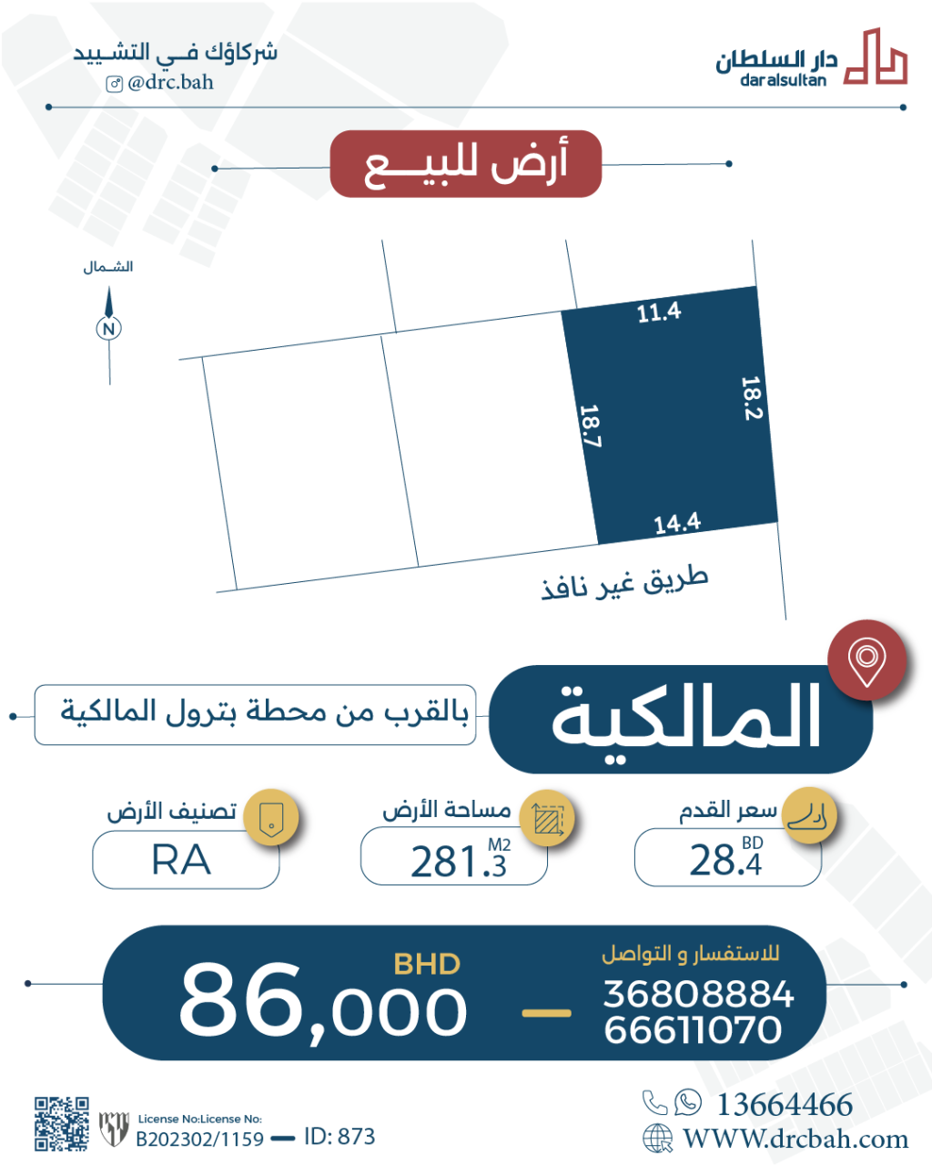 Residential Land for Sale in Malkiya with a classification of RA (Private Residential Area - A). The Land size is 281.3 SQM, priced at 28.40BHD per SQFT , with a total price of 86,001.728BHD