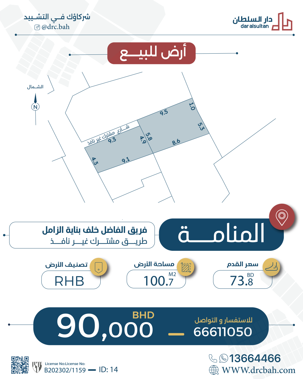 Residential Land for Sale in Manama with a classification of RHB (Connected Residential Area – B). The Land size is 58.1 SQM, priced at 80,000.00BHD per SQFT , with a total price of 127.920BHD