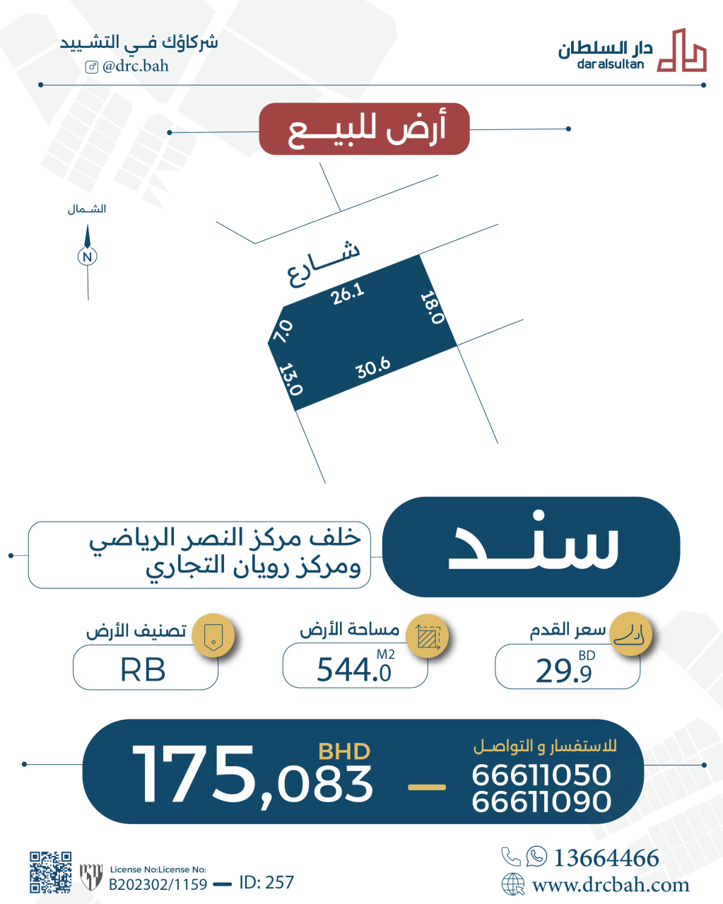 Residential Land for Sale in Sanad with a classification of RB (Private Residential Area - B) located on Two Roads (Corner). The Land size is 544 SQM, priced at 29.90BHD per SQFT , with a total price of 175,083.038BHD