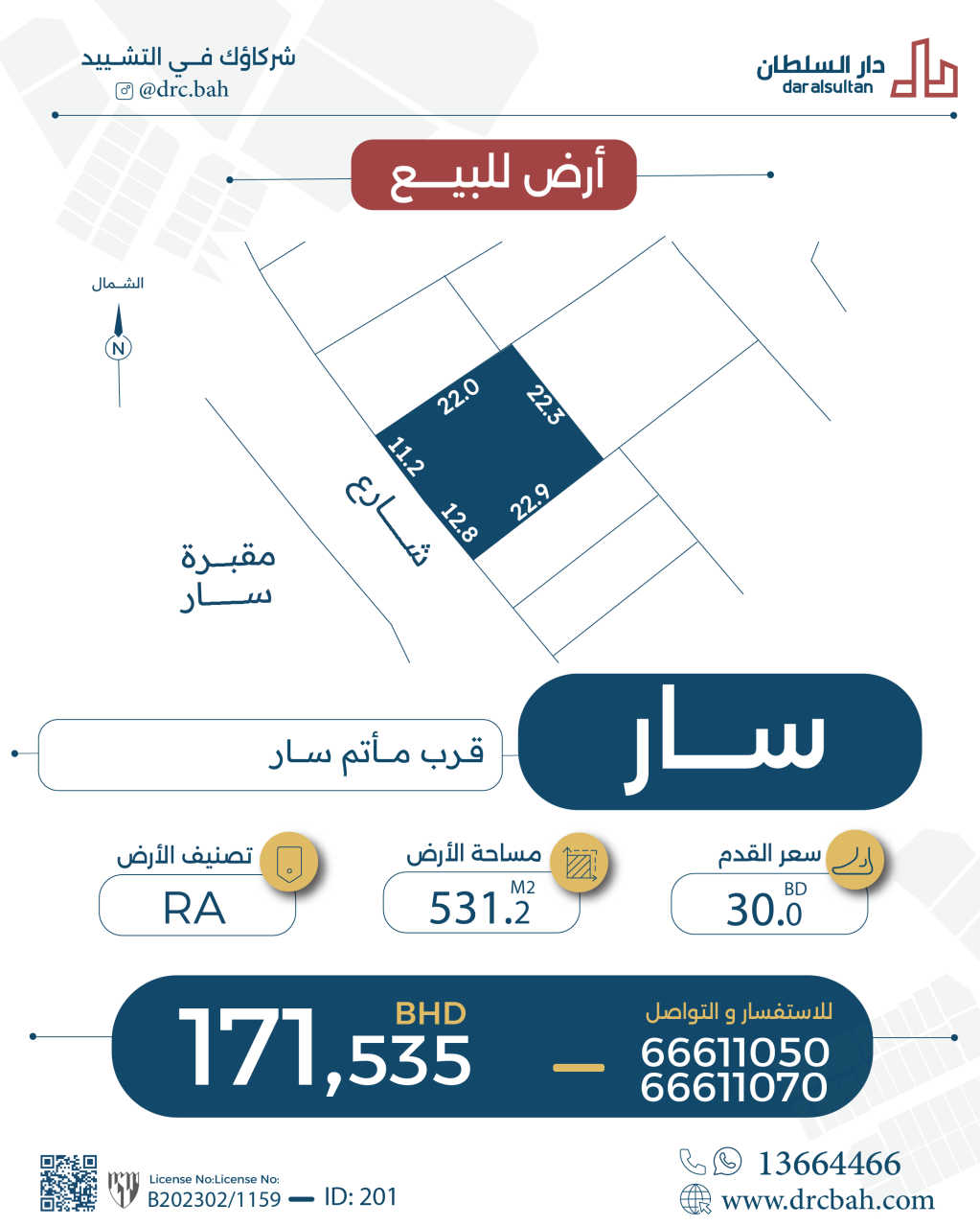 Residential Land for Sale in Sar with a classification of RA (Private Residential Area - A) located on One Road. The Land size is 531.2 SQM, priced at 30.00BHD per SQFT , with a total price of 171,535.200BHD
