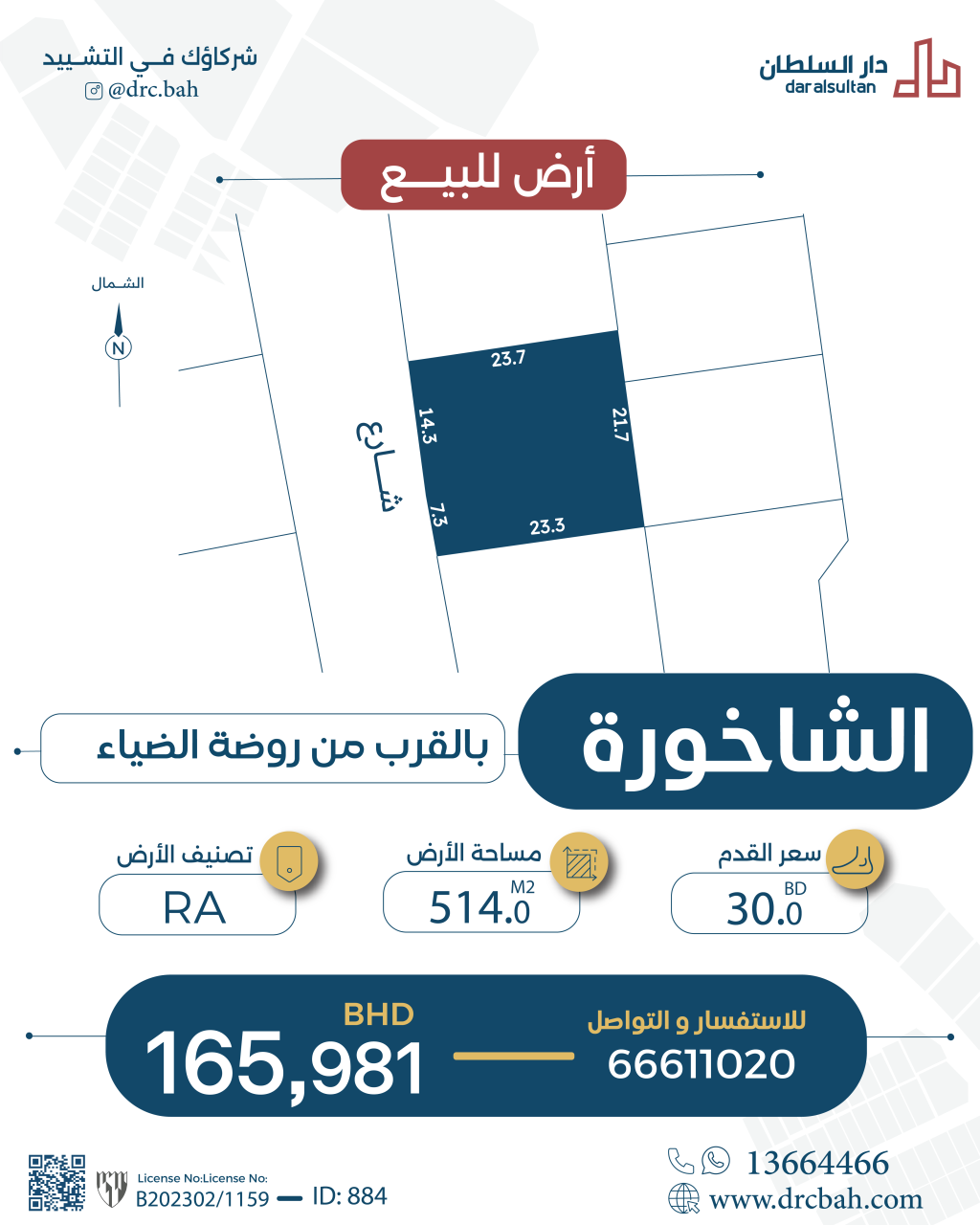 Residential Land for Sale in Shakhoora with a classification of RB (Private Residential Area - B). The Land size is 514 SQM, priced at 30.00BHD per SQFT , with a total price of 165,981.000BHD