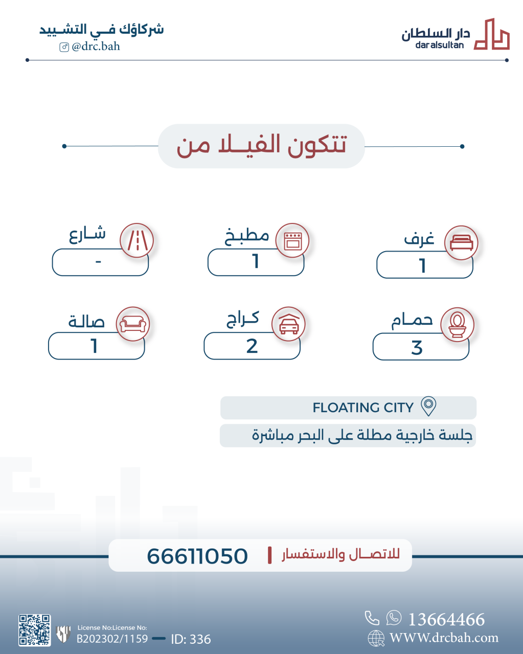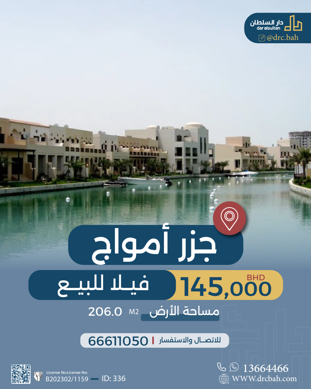 Residential Villa for Sale in Amwaj Island with a classification of SP (Special Nature Projects Areas) located on One Road. The Villa size is 206 SQM, with a total price of 125,000.000BHD , Furnished