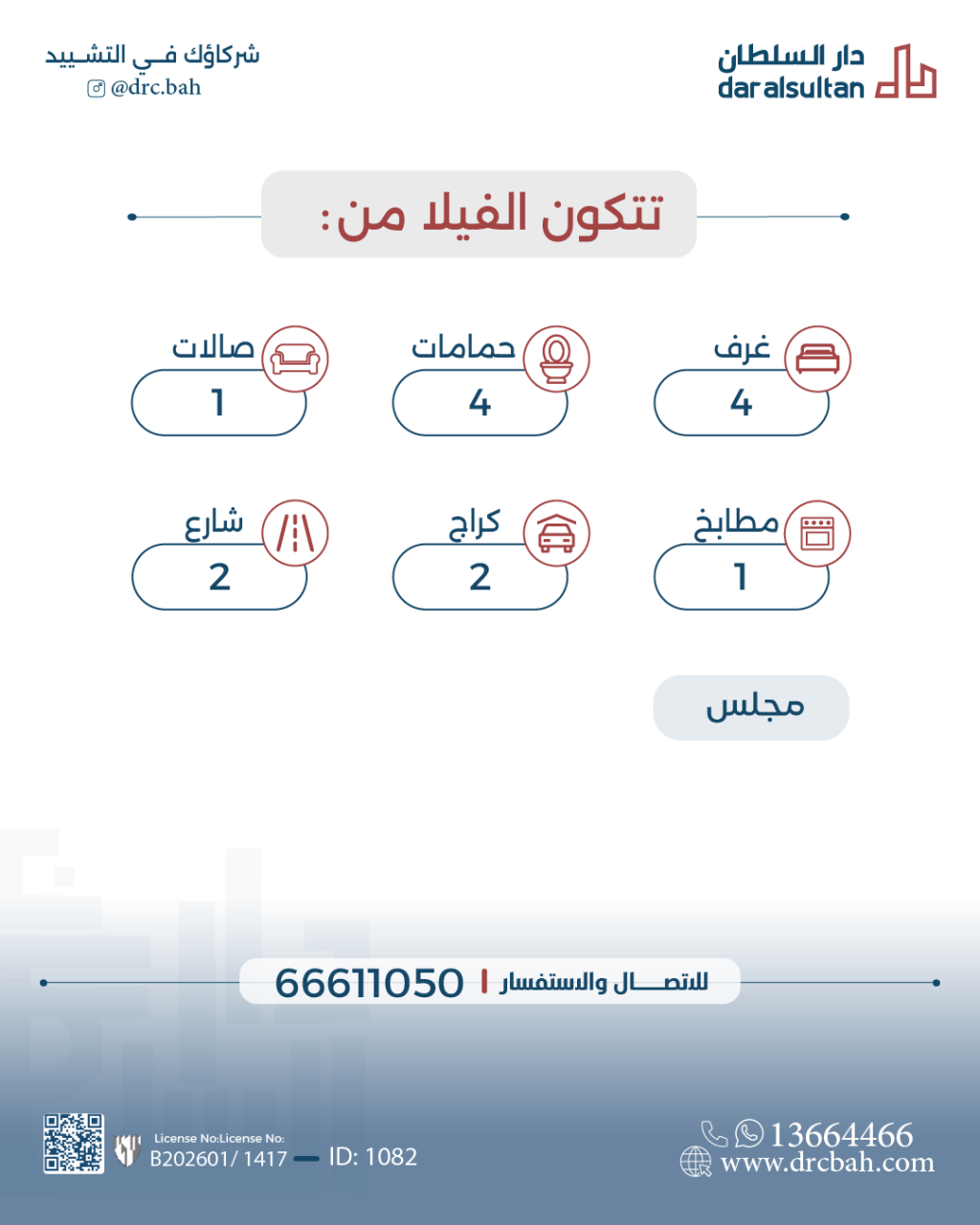 Consists of: 4 Rooms, 4 bathrooms, 1 Majles, 1 Kitchens, 2 Parking