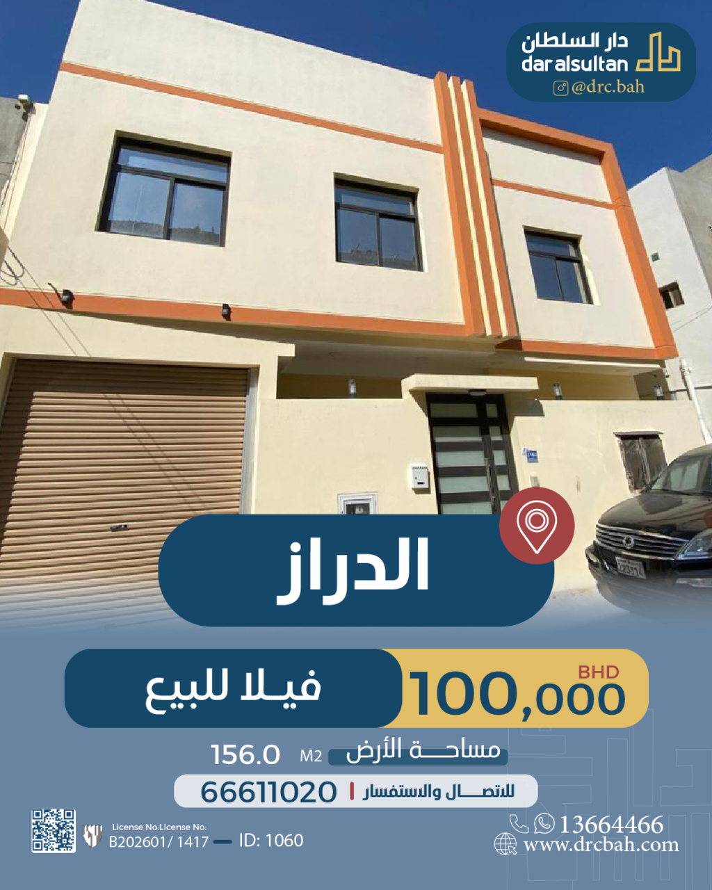 Residential Villa for Sale in Duraz with a classification of RHA (Connected Residential Area – A) located on One Road. The Villa size is 156.2 SQM, with a total price of 100,000.000BHD , property condition is New