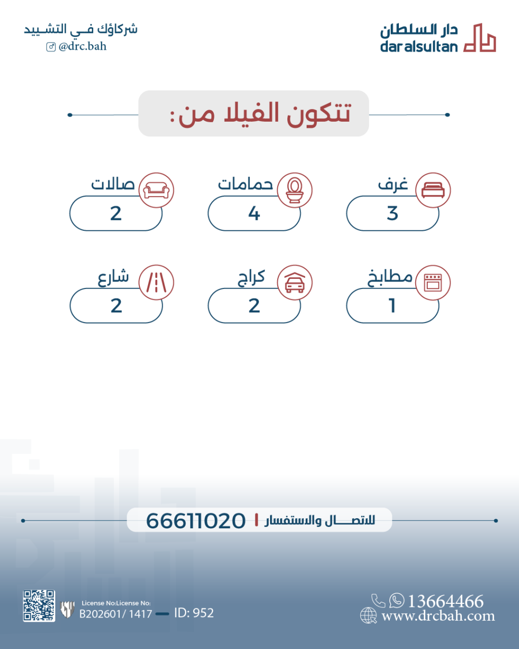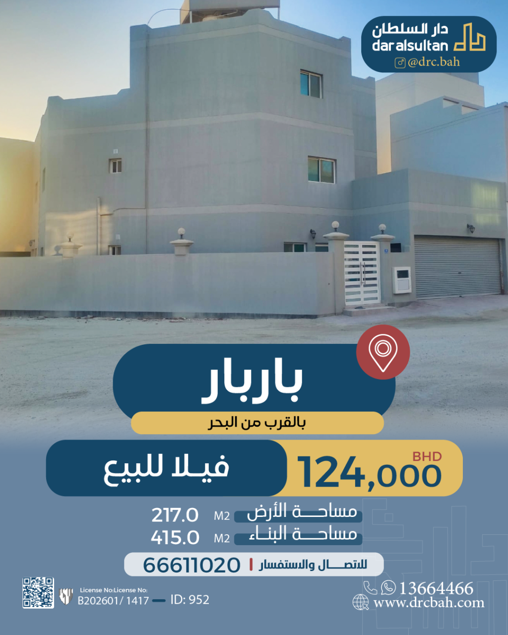 Residential Villa for Sale in Duraz with a classification of RA (Private Residential Area - A). The Villa size is 217 SQM, with a build up size of 415 SQM, with a total price of 128.000BHD , Unfurnished, property condition is New