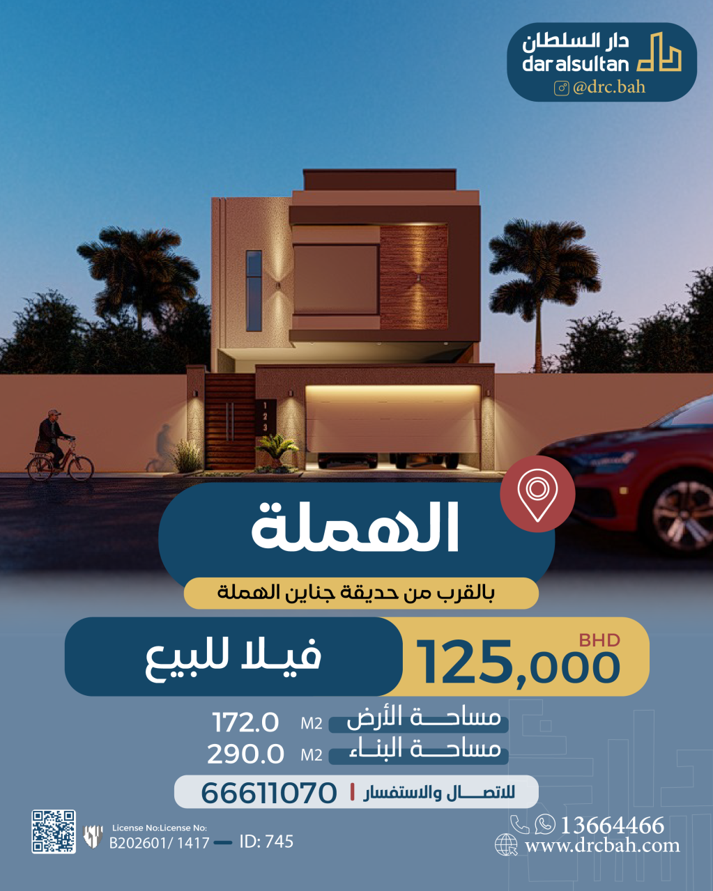 Residential Villa for Sale in Hamalah. The Villa size is 172 SQM, with a build up size of 290 SQM, with a total price of 125,000.000BHD