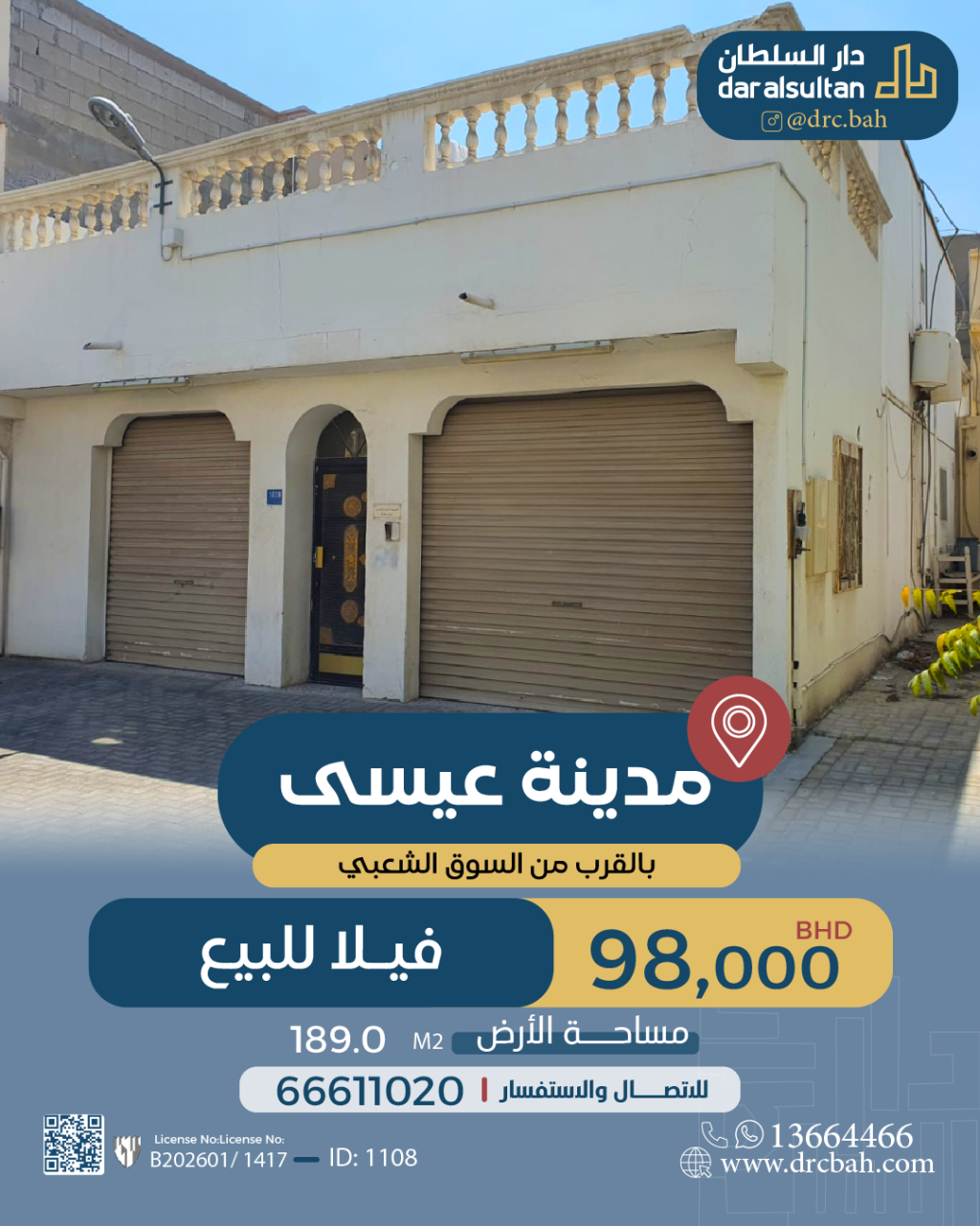 Residential Villa for Sale in Isa Town located on One Road. The Villa size is 189 SQM, with a total price of 98,000.000BHD