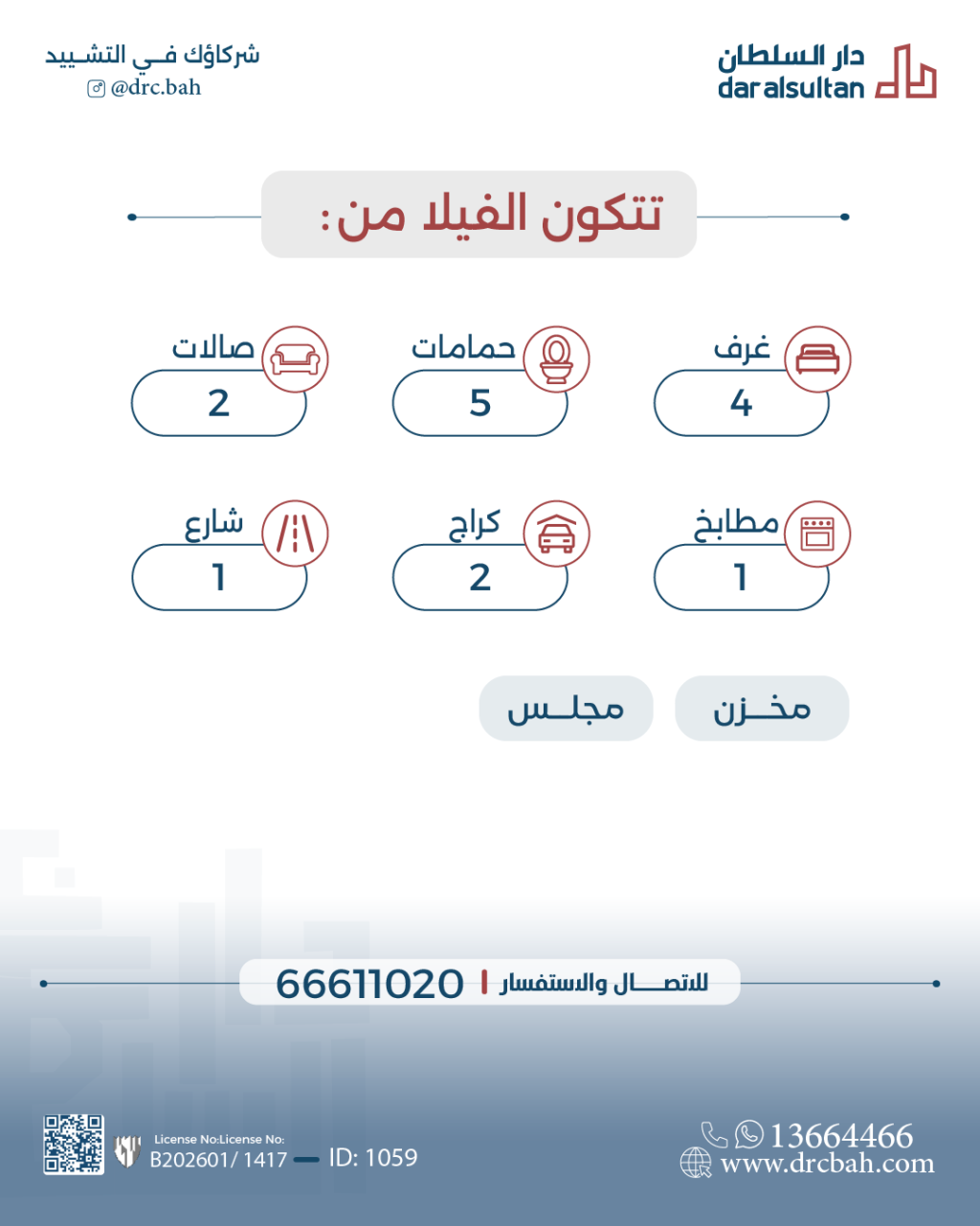 Consists of: 2 Floors, 4 Rooms, 3 Master Rooms, 5 bathrooms, 1 Majles, 1 Kitchens, 2 Halls, 1 Stores, 2 Parking