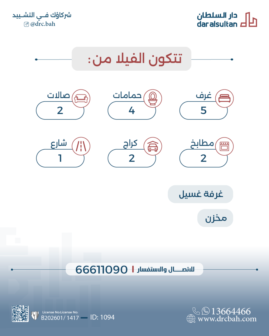 Consists of: 5 Rooms, 4 bathrooms, 2 Kitchens, 2 Halls, 1 Stores
