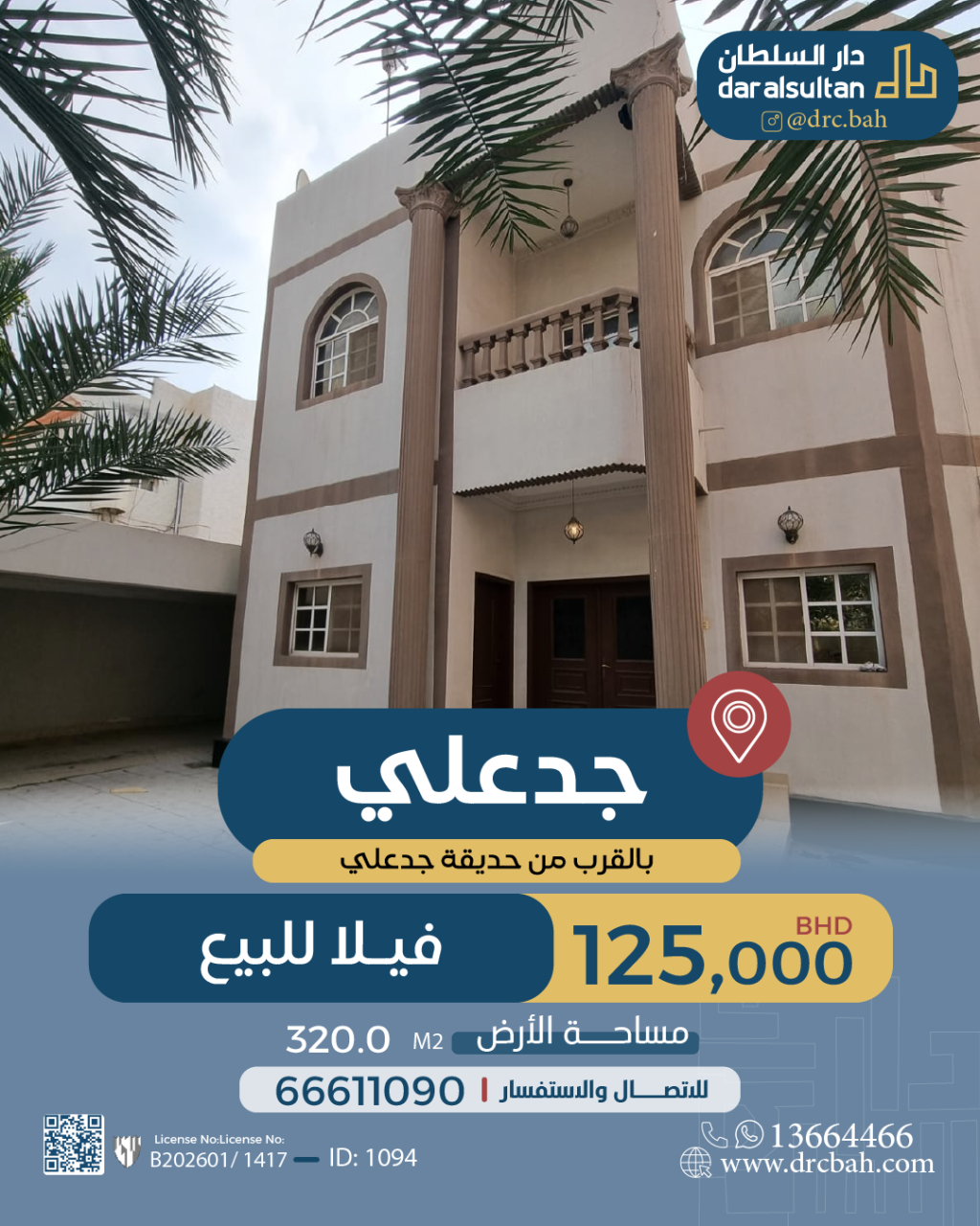 Residential Villa for Sale in Jid Ali. The Villa size is 320 SQM, with a total price of 125,000.000BHD