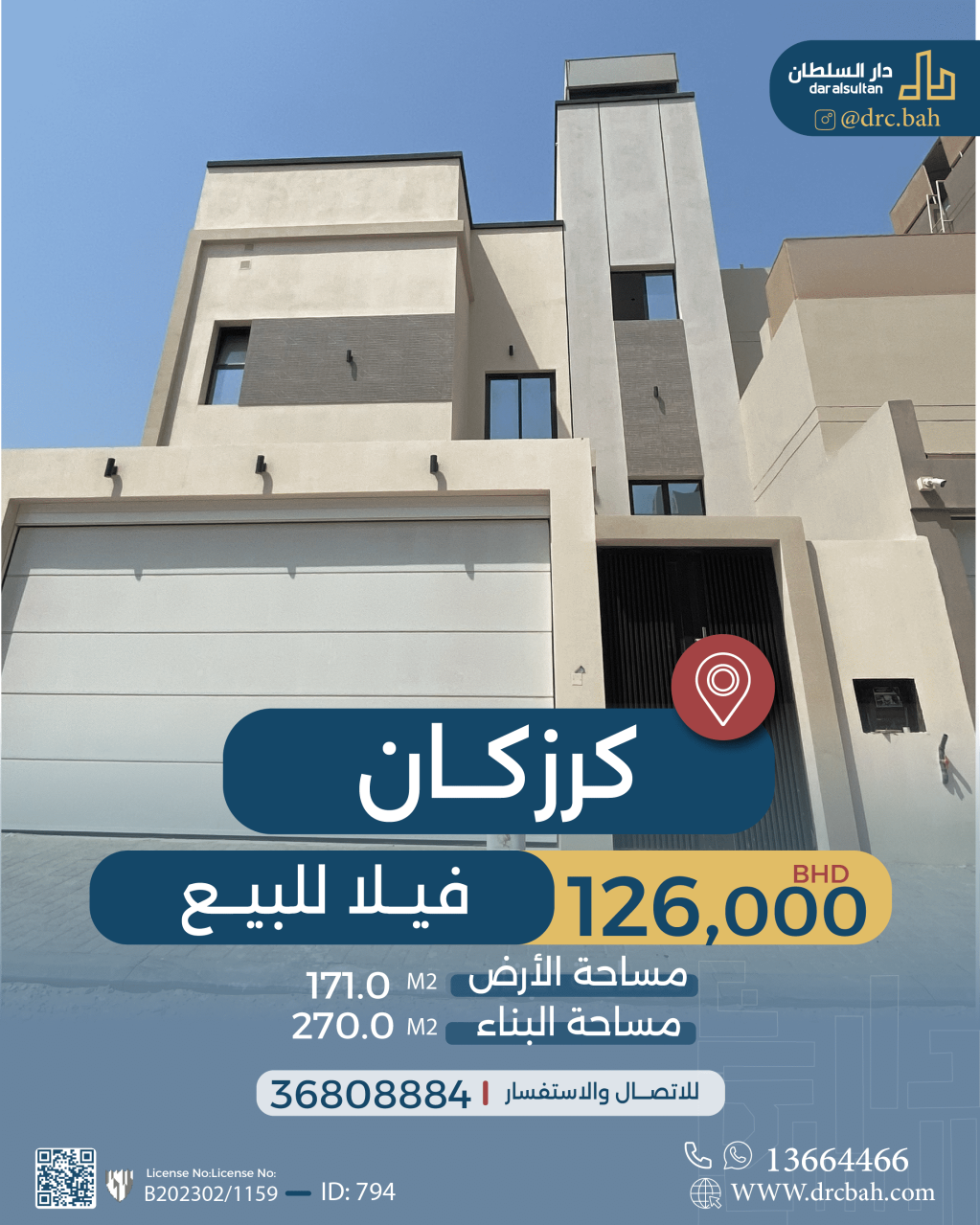 Residential Villa for Sale in Karzakan. The Villa size is 171.1 SQM, with a build up size of 270 SQM, with a total price of 126,000.000BHD