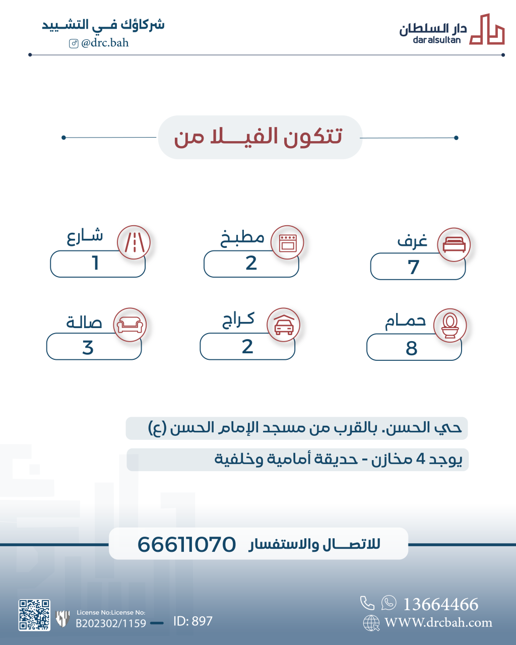 Consists of: 2 Floors, 7 Rooms, 2 Maid Rooms, 8 bathrooms, 2 Kitchens, 3 Halls, 4 Stores, 2 Parking
