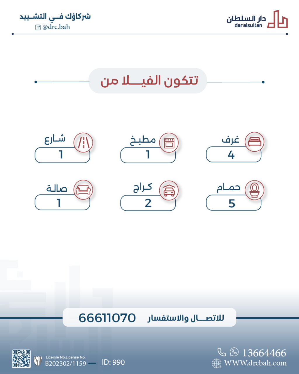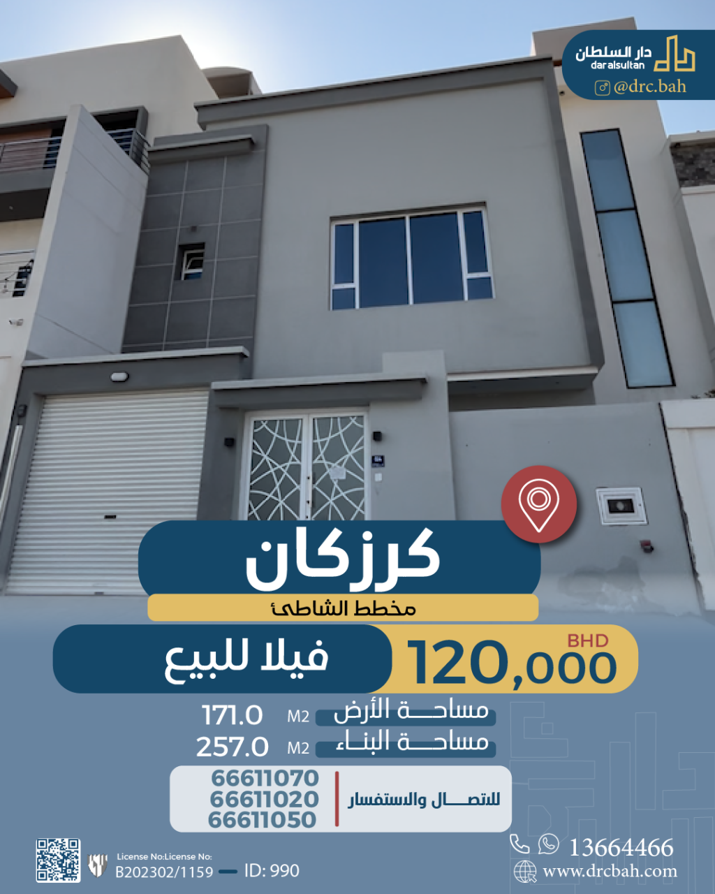 Residential Villa for Sale in Karzakan. The Villa size is 171 SQM, with a build up size of 275 SQM, with a total price of 120,000.000BHD