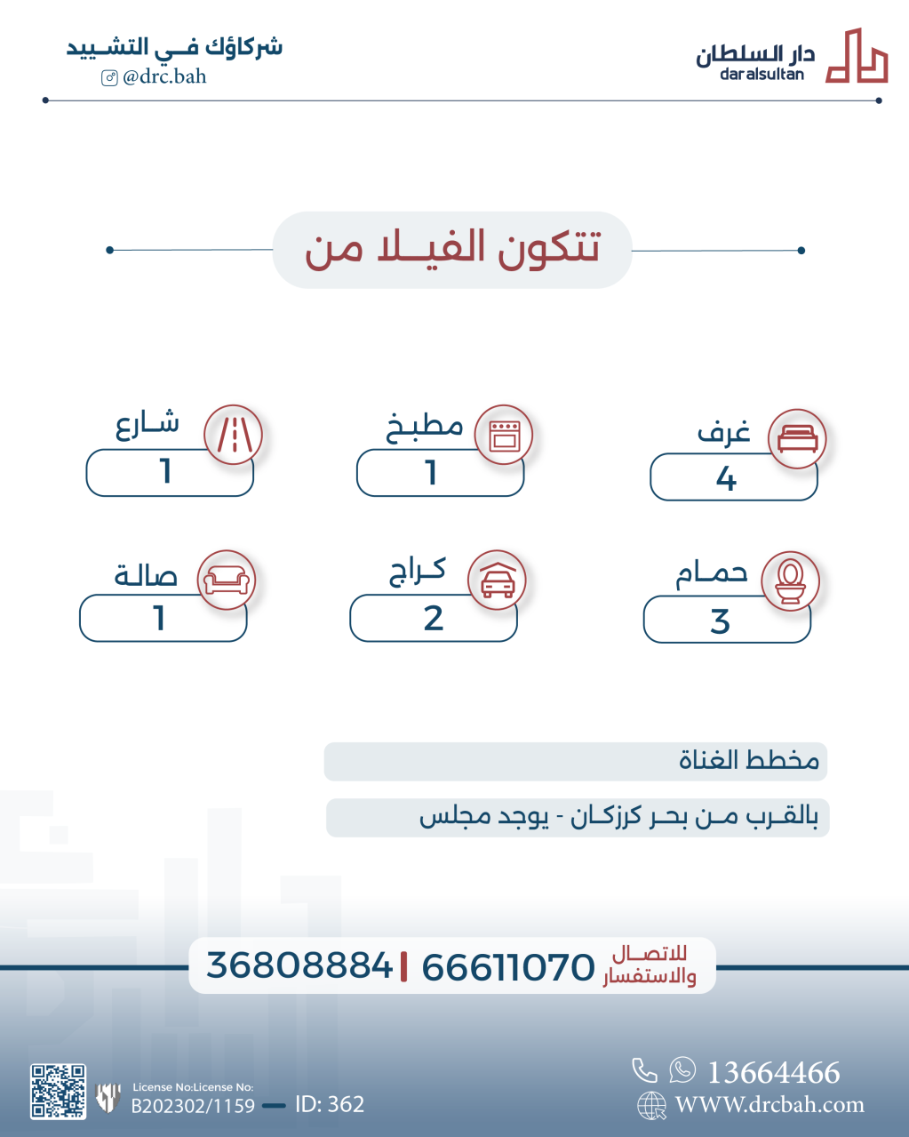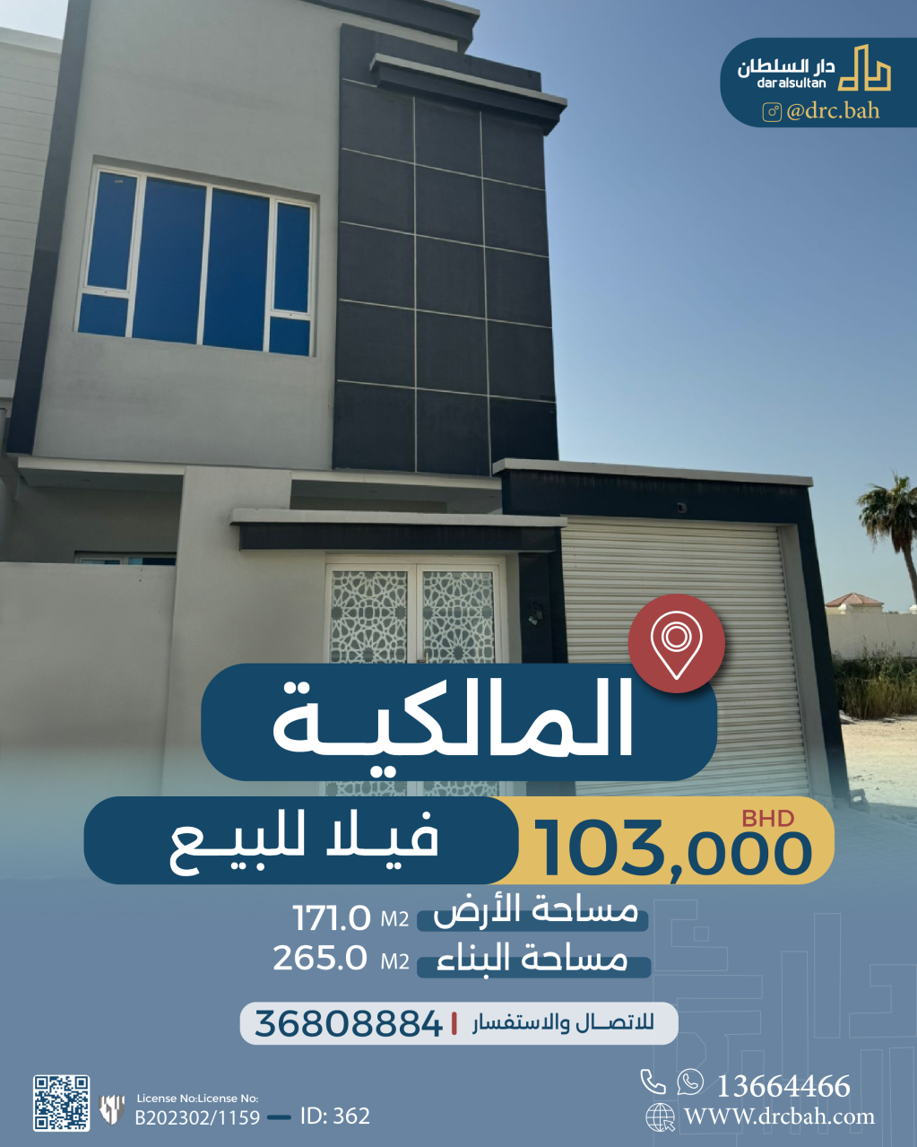 Residential Villa for Sale in Malkiya. The Villa size is 165 SQM, with a building size of 265 SQM, with a total price of 103,000.000BHD