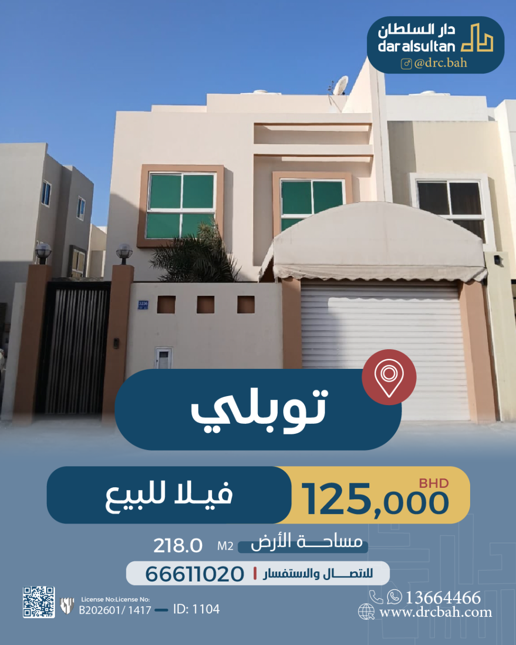Residential Villa for Sale in Tubli with a classification of RHA (Connected Residential Area – A) located on One Road. The Villa size is 218 SQM, with a total price of 125,000.000BHD , Semi Furnished