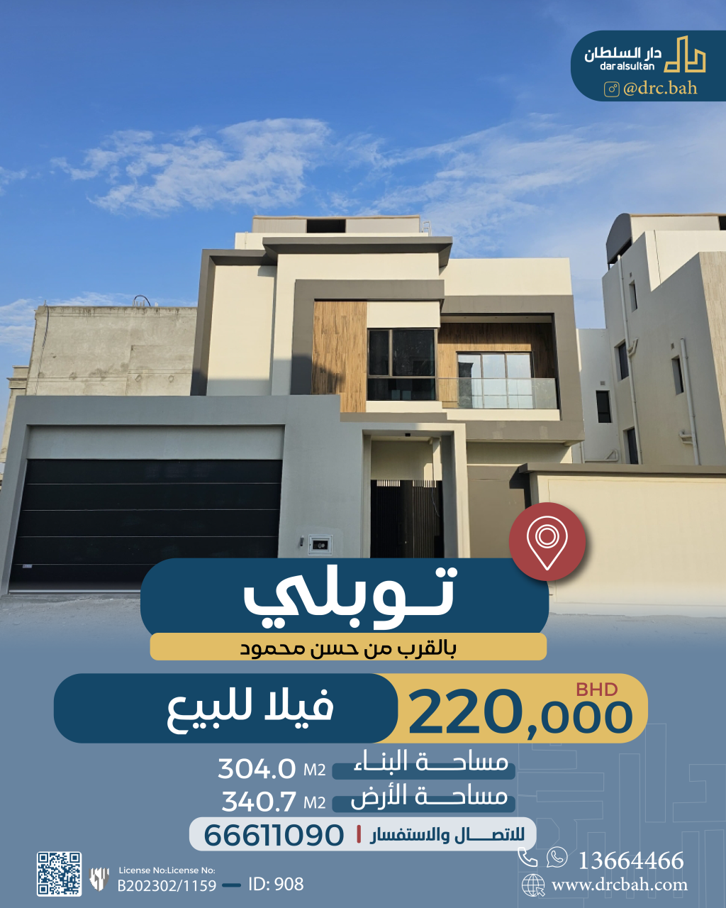 Residential Villa for Sale in Tubli. The Villa size is 340 SQM, with a build up size of 304 SQM, with a total price of 220,000.000BHD